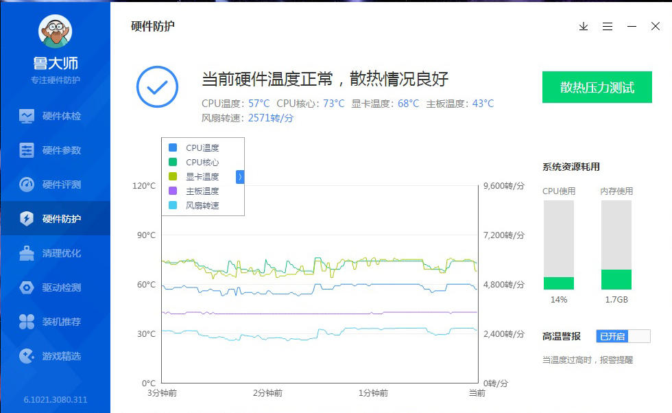 接下来使用鲁大师正式版对台电C24 Air A8C进行功耗和发热的测试,屏幕80%亮度+约22℃室温,待机状态下,CPU的温度维持在56℃,显卡的温度维持在68℃,主板的温度维持在43℃,风扇转速2571转/分钟。