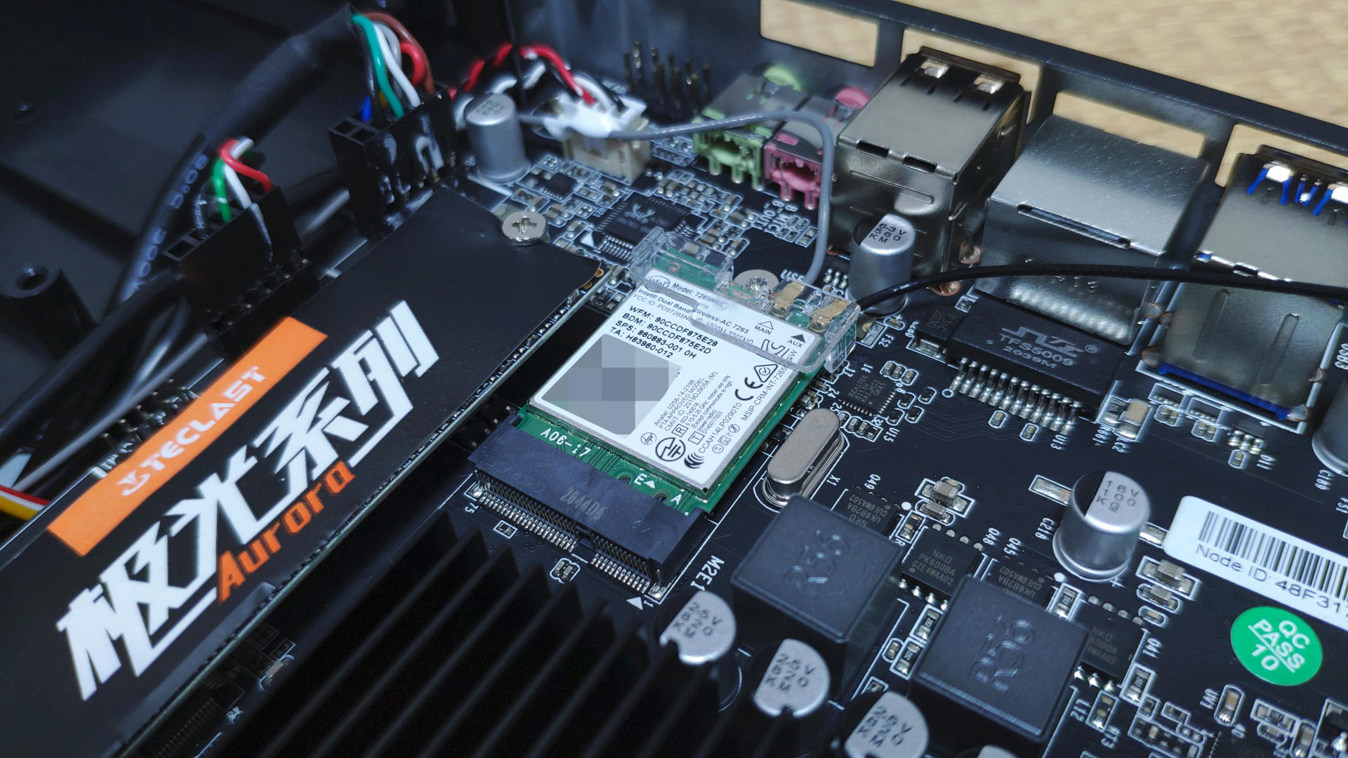 通过两根天线来判断,固态硬盘左侧那块绿色PCB板卡是无线网卡,型号是Intel Dual Band Wireless-AC 7265。