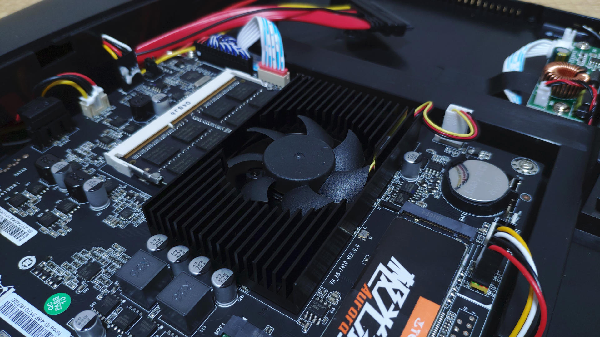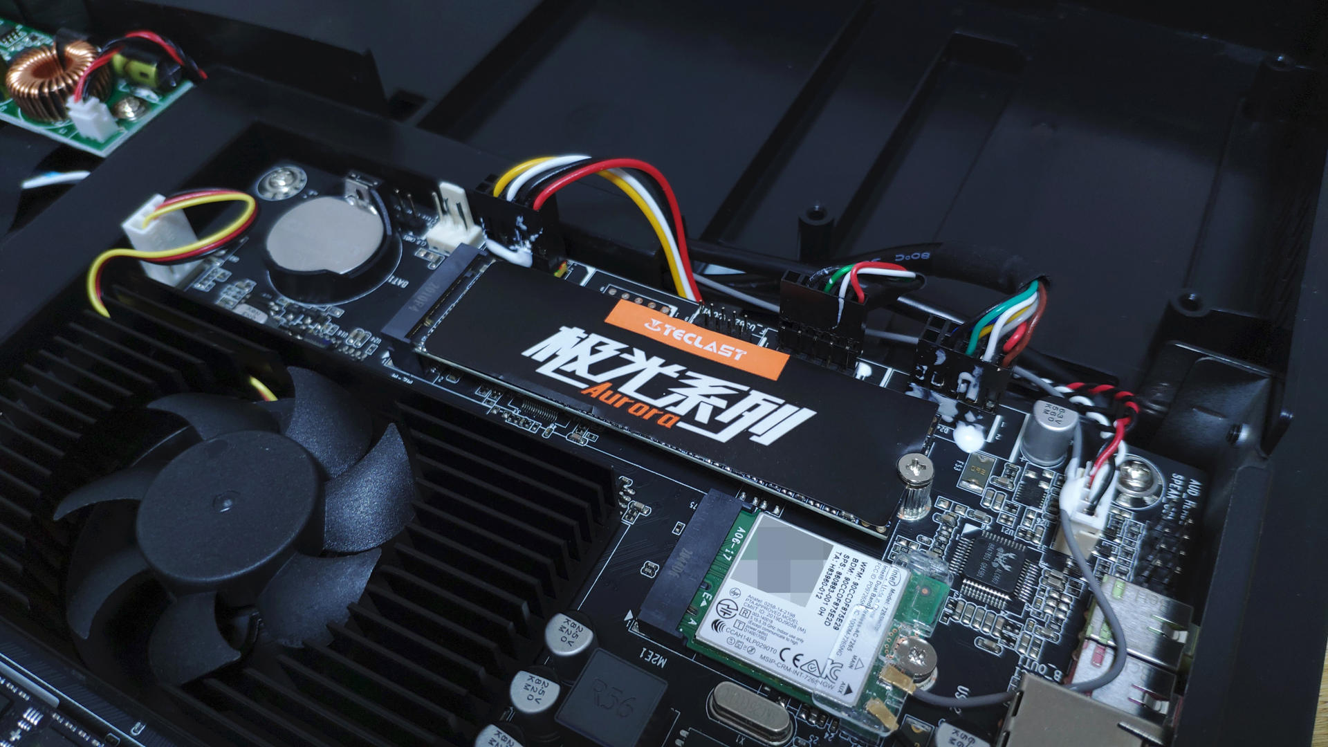 内部零部件的布局就如下图所示,主板的尺寸比常规的尺寸要更小一点,黑色的PCB板材,可以很明显地看出内存条和固态硬盘,固态硬盘是一块M.2接口(SATA协议)256GB台电品牌,内存条是一条8GB DDR3 1600台电品牌。