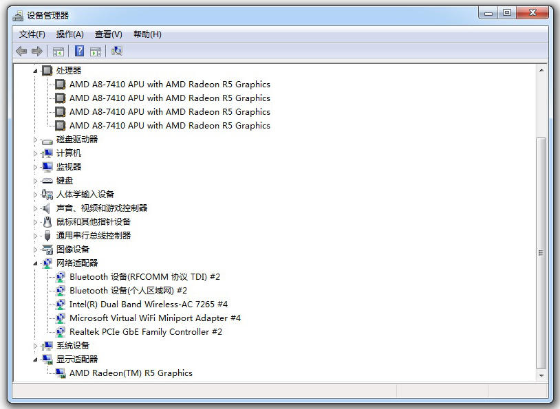 在设备管理器里可以看到硬盘、网卡、显卡的型号和参数,硬盘是一块台电256GB SSD,网卡是一块支持WIFI的无线网卡,显卡是APU集成的Radeon R5,至于详细的硬件信息可以看下文硬件拆解部分。
