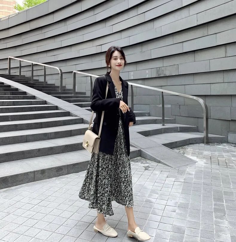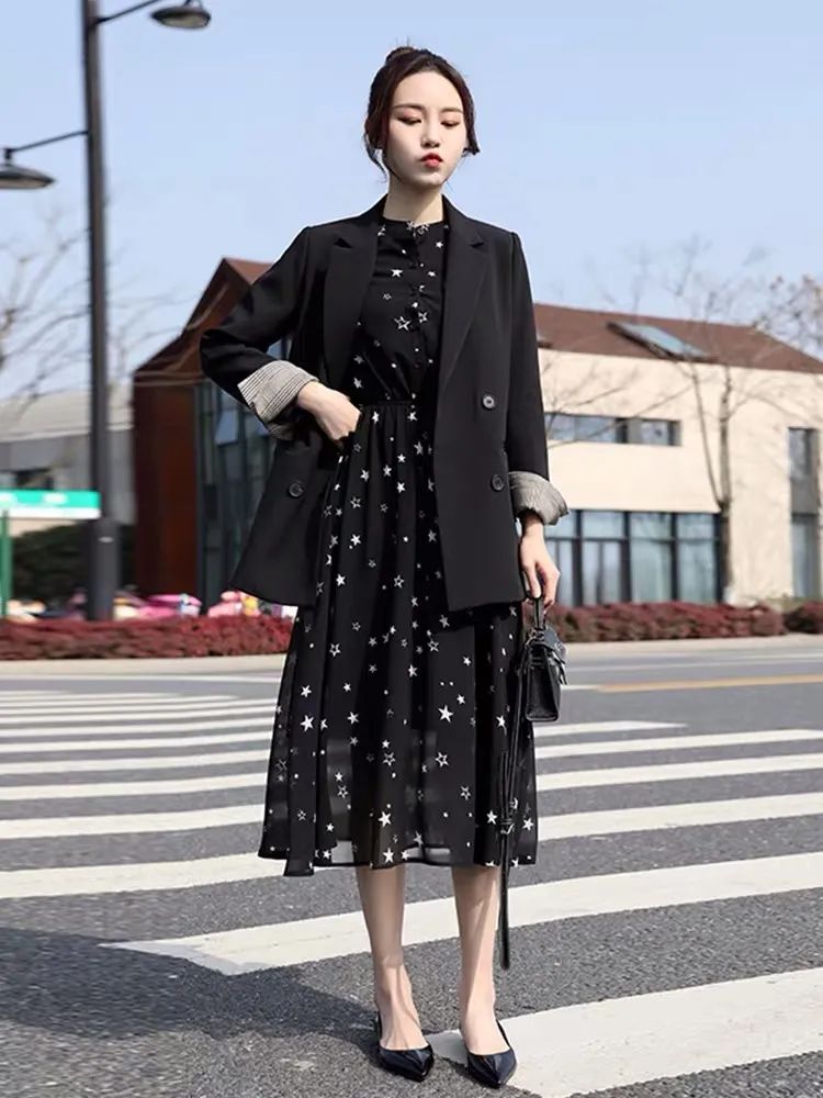 西装和连衣裙的经典穿搭,相信有很多的上班族都屡试不爽,既能够穿出女性的柔美,又能够穿出职场女性该有的洒脱干练。