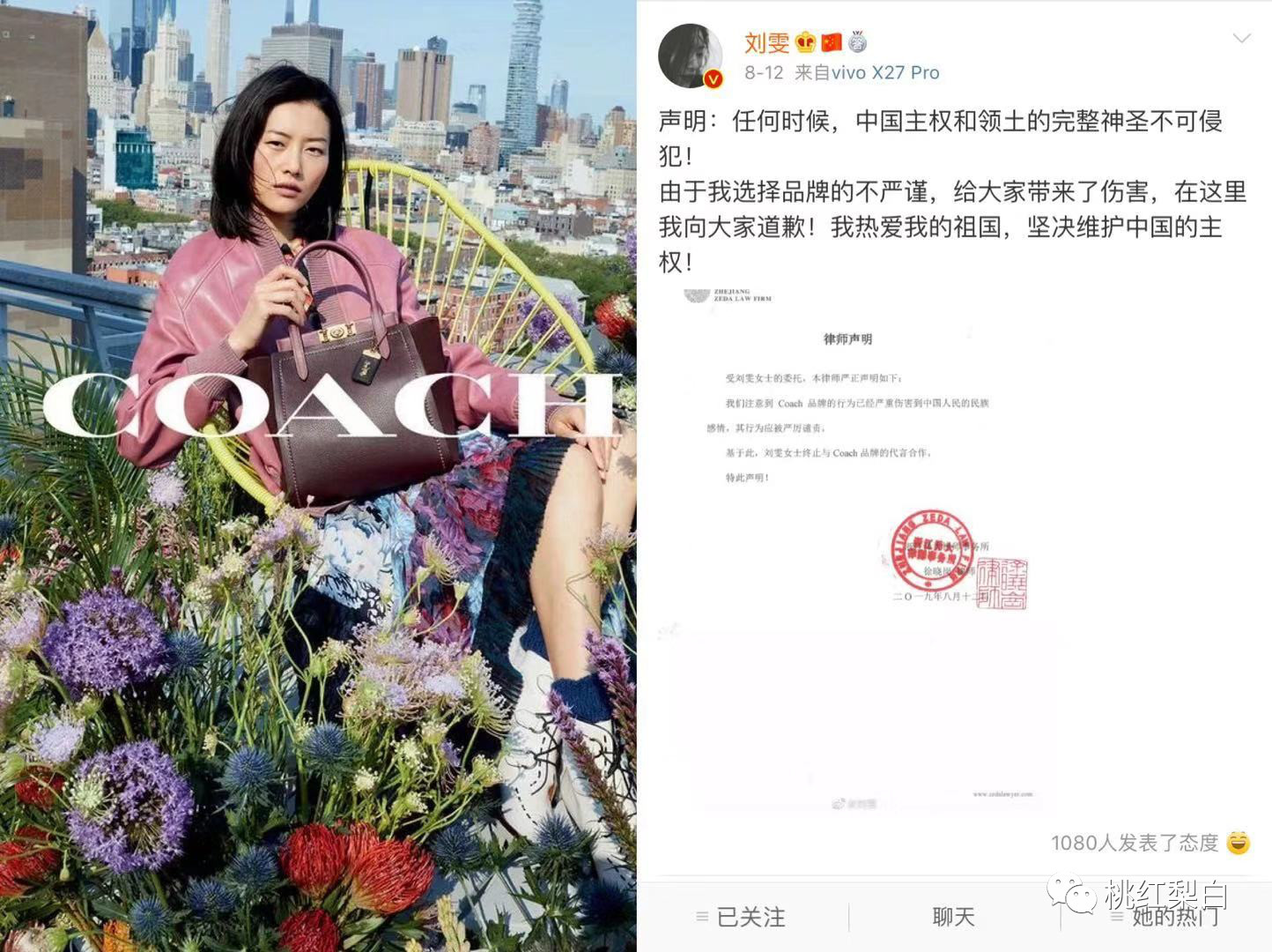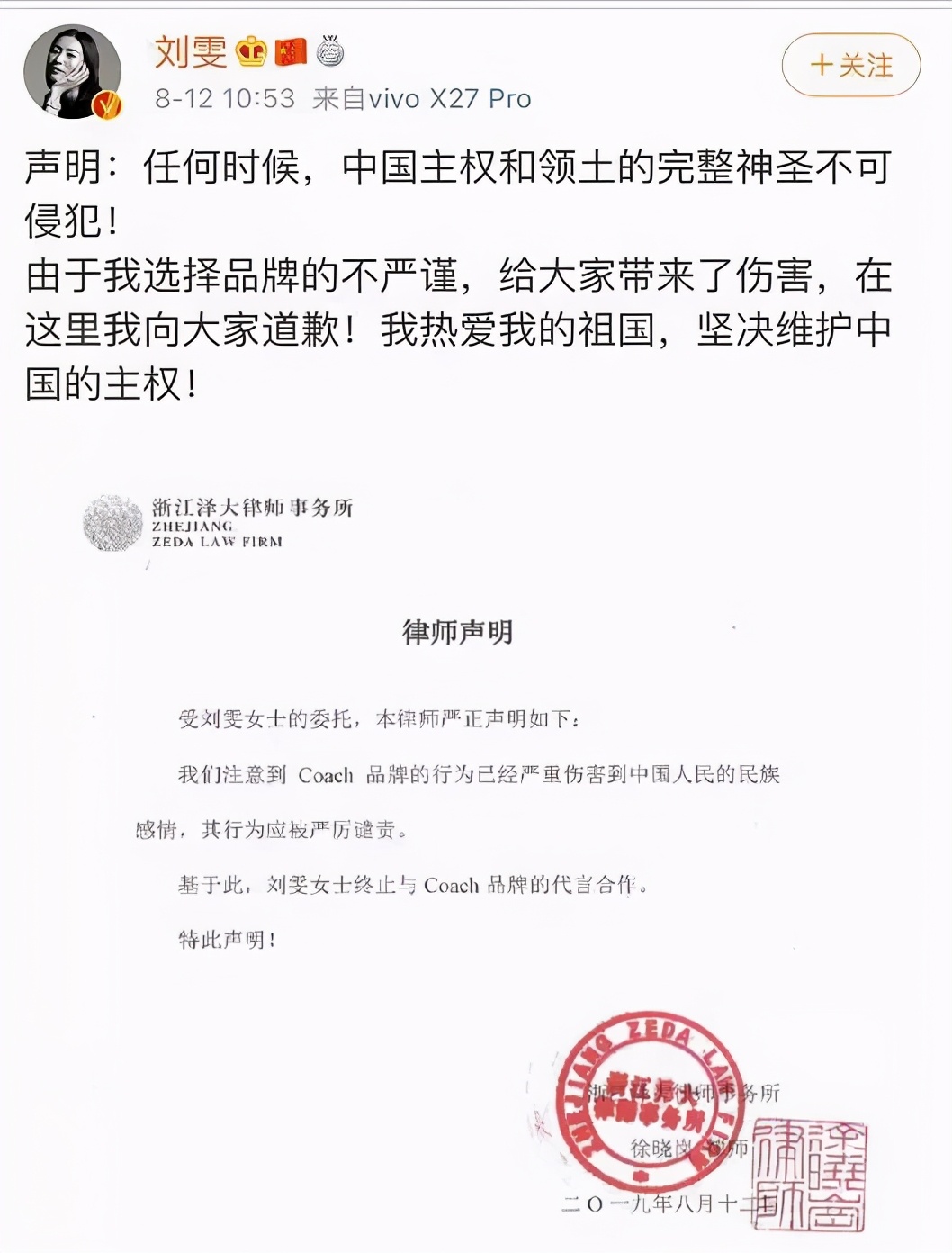 和一般艺人由工作室官宣解约的模式不同,刘雯是自己私下找的律师,在这个事情刚开始传播没多久的时候,就很刚地直接在自己微博上po了单方面解除合约的声明。