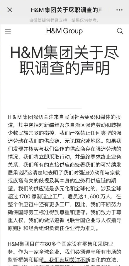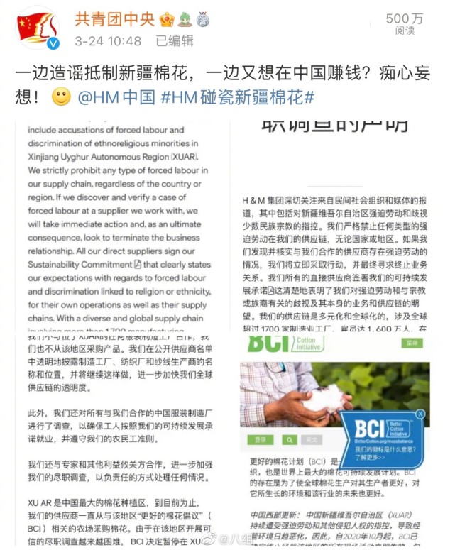 H&M关注到了一份所谓的“民间社会组织和媒体的报告”,报告声称新疆棉是涉嫌强迫人非法劳动所获得的产品,因此决定取消采购产品.......