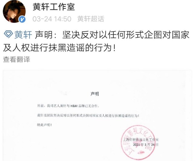 今日(24日)下午,@黄轩工作室官方微博就发表声明称,坚决反对以任何形式企图对国家及人权进行抹黑造谣的行为!宣布终止与H&M的合作。