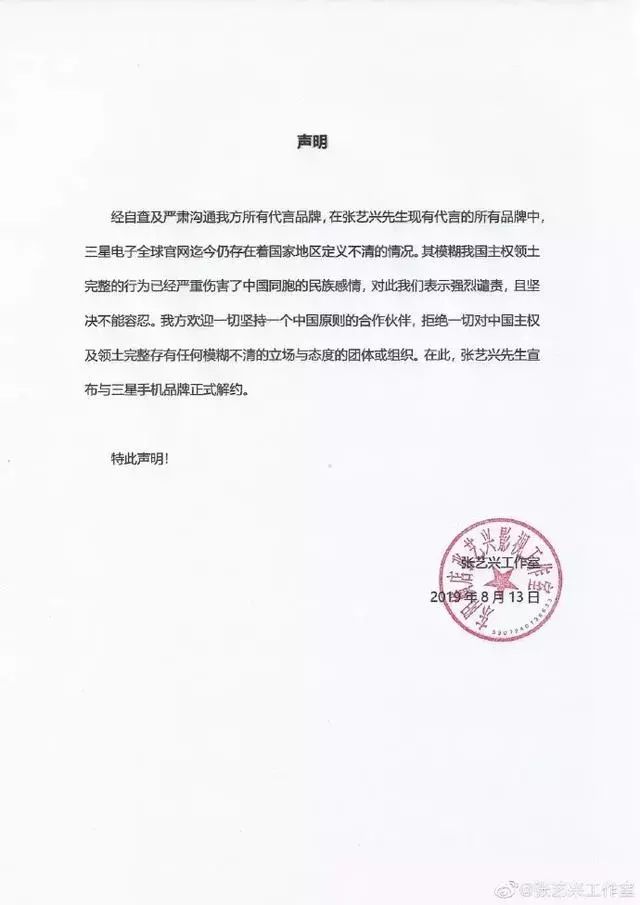 因三星手机一直模糊我国主权问题,张艺兴坚决维护中国领土完整原则,与其解约,不再合作。