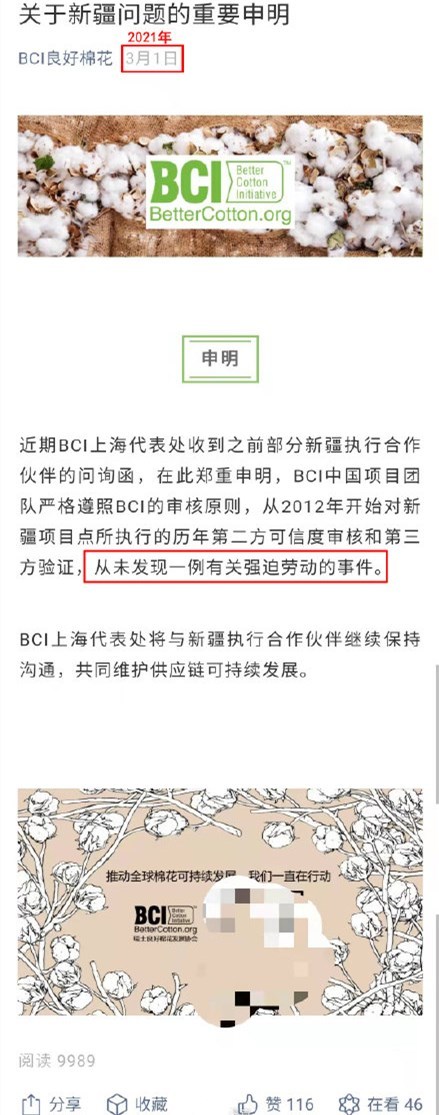 在造谣新疆棉生产有违人权之后,今年3月1日又称:“新疆项目......从未发现一例有关强迫劳动的事件。”