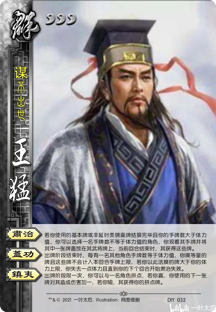 三技能镇夷,如果说肃治是核心,盖功是发动机,那么这个技能就是火炮,用于增加输出能力,由于肃治的存在,基本不用担心拼点超出王猛控制,顺便一提,该技能还有递牌功能,以及调整场上角色手牌数的能力。