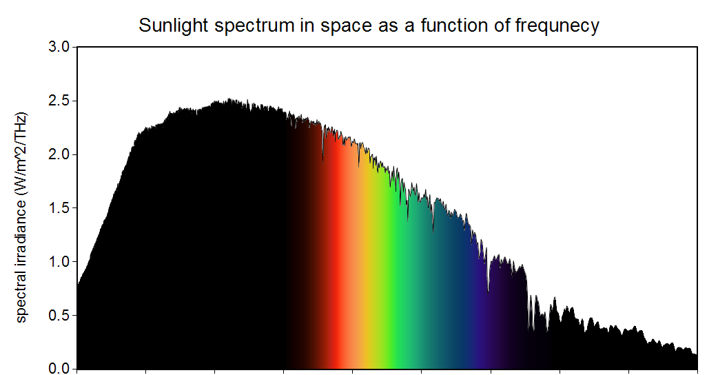 图解:太阳光谱在空间中作为频率的函数-太阳光在空间中的光谱是频率的函数。