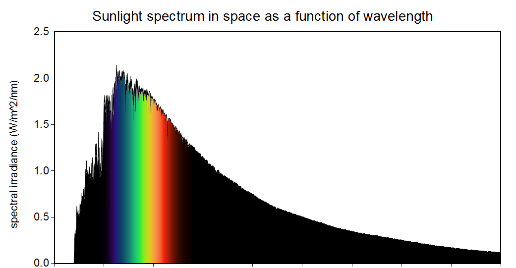图解:太阳光谱在空间中作为波长的函数-太阳光在空间中的光谱是波长的函数。公共域图像,图像来源:克里斯托弗·S·贝尔德,数据来源:美国材料与试验学会地面参考。