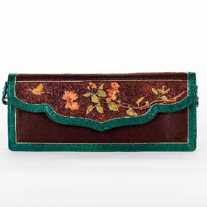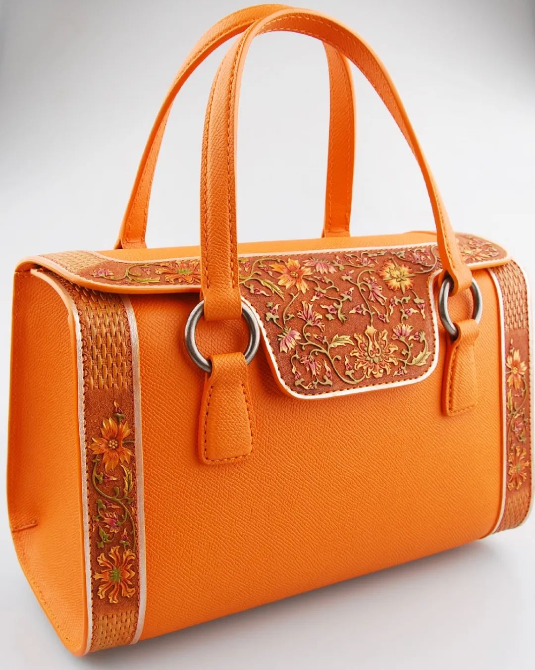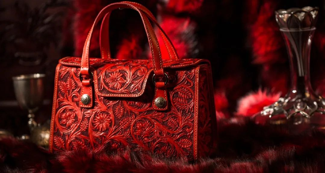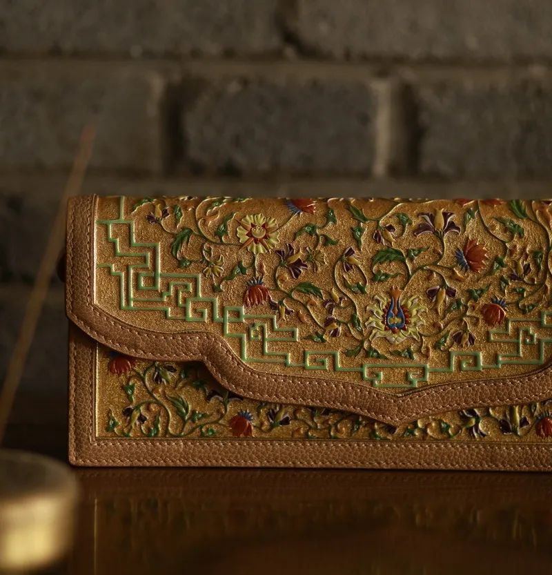 这款剔红包,灵感来源于传统漆器工艺剔红。透染植鞣皮,是含有单宁酸的植物枝叶,把皮切开,连截断面都是红的。再配上传统吉祥纹饰唐草满雕,寓意幸福安康、鸿运延绵不绝,日进斗金、家运蒸蒸日上。