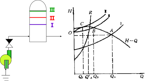 ①向压头较大且周期性发生变化的容器液位供液: Ⅰ→Ⅱ→Ⅲ供液,工况点A → B → C。Ⅱ←→Ⅲ波动变化,工况点在B←→C←→O变化,导致周期性水击,产生噪音和振动。