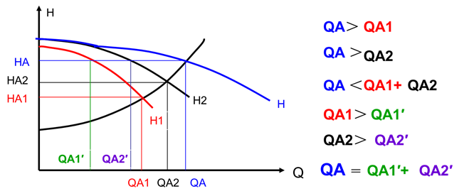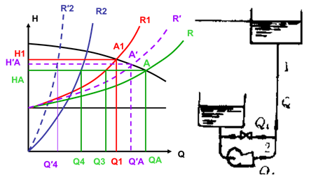 不开旁通阀,A1(Q1, H1);开旁通阀,同样扬程下,两并联管路流量相加,泵A(QA, HA)。主管路(Q3, HA),回流管(Q4, HA);关小回流阀,泵流量减小,扬程增加,主管路流量增加;开大回流阀,泵流量增大,扬程减小,则主管流量减少。
