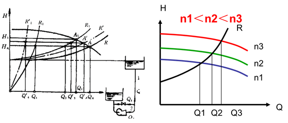 特点:方法简单,经济性差,节流引起发热。若泵特性曲线平坦(ns小)且管路特性曲线平坦(阻力小)时,则节流损失小。一般不用关小吸入阀的方法调节。