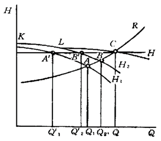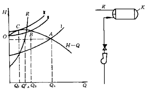 ②向含有空气的高阻力管路供液:K处有气体,K与泵间的管路特性为Ⅰ,K以后的管路特性为R,QA>Q`A气体被压缩压力升高工况点A→B→C,直到Q=0,K后液体流出,气体膨胀压力下降,泵与K间的管路特性降至Ⅱ要下移时,工况点到B,引起喘振。