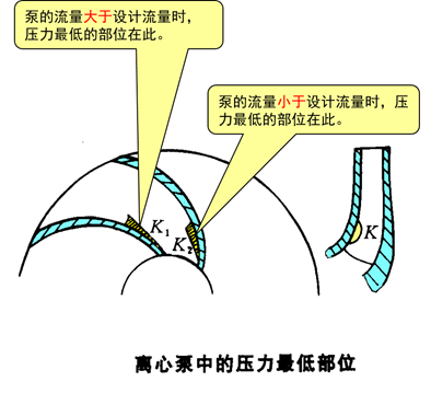 当Q超过设计Q时,w1撞击叶片背面,最低压力部位在叶片进口靠近前盖板的叶片正面上,如图K1处。