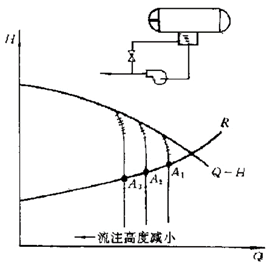 使泵在稳定汽蚀状况下工作来调节流量的方法。凝水水位越低,流注吸高越小,有效汽蚀余量越小,断裂工况线左移,流量减小。要求:设计良好的管路特性;水位应在一定范围波动(设蓄水室);设回流管以防水位过低。