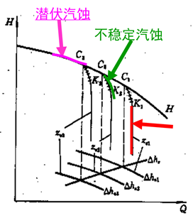 1、随流量增大,当△ha>△hr但未降到很低时,汽蚀已经发生但尚未明显影响到泵的性能,此状态称为潜伏汽蚀。