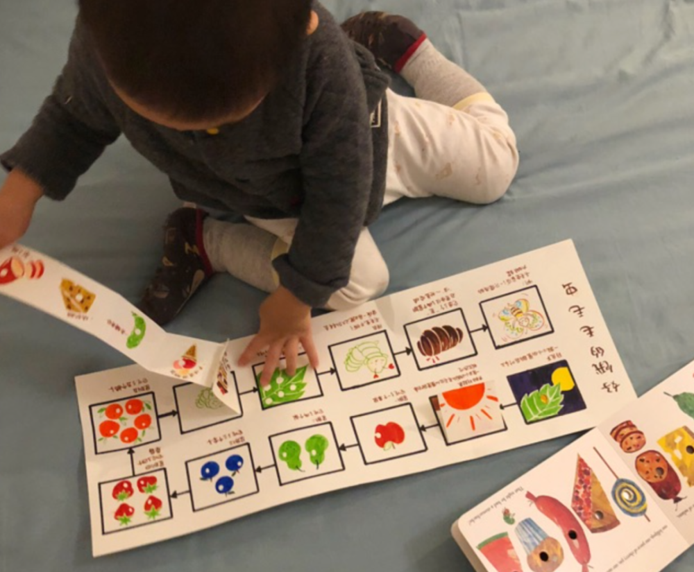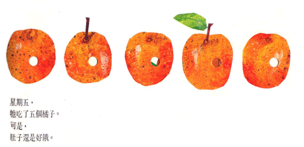 比如,给孩子读卡尔爷爷《好饿的毛毛虫》。