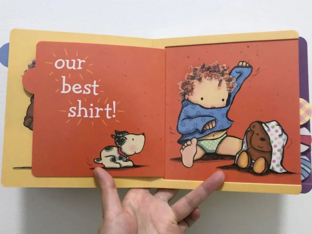 小朋友翻到穿衣服这一页,她自己会拿起旁边的衣服试试;