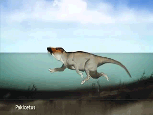 巴基斯坦鲸(Pakicetus)是已知最早的鲸类之一,这种生活在5000万年前的动物看上去就像是一条狗,拥有长长的四肢,身上长着毛发。仔细观看巴基斯坦鲸,你会发现它的鼻子在脑袋前端,就像今天的哺乳动物一样。正是因为巴基斯坦鲸的鼻孔在嘴巴前端,所以它们游泳的时候应该像今天的狗一样,要始终将脑袋抬出水面,四肢则以狗刨的方式游泳,画风是这个样子的: