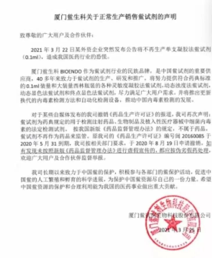 与安度斯的态度不同,3月25日,厦门鲎生科发布了《厦门鲎生科关于正常生产销售鲎试剂的声明》,并认为“某外资企业”发布公告“造成我国医药行业的恐慌”,声明称“尽力满足广大用户需求”。
