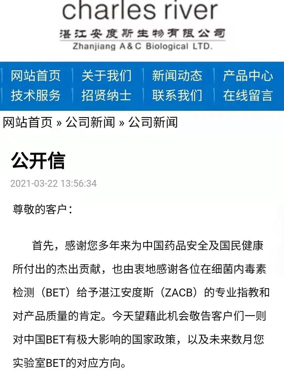 3月22日,湛江安度斯生物公司发布消息称,受国家政策影响,内毒素检测试剂所用原料鲎(hòu)被列为国家二级保护动物(国家林业和草原局、农业农村部2021年2月25日公告),意味着BET试剂原料将受到严格的管控,担忧国内药品、医疗器械的放行即将面临困境。