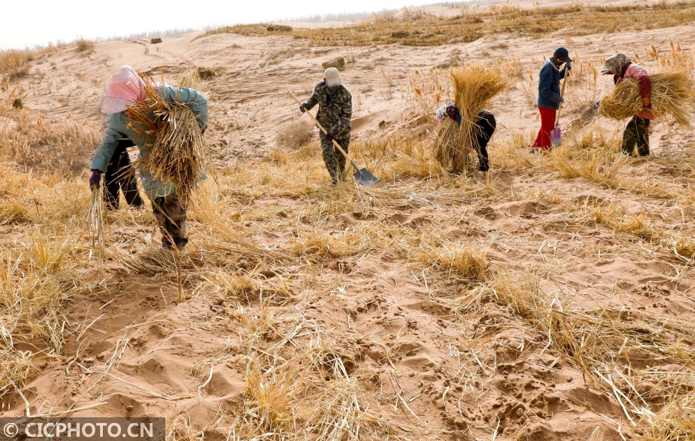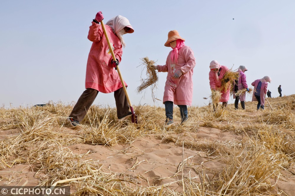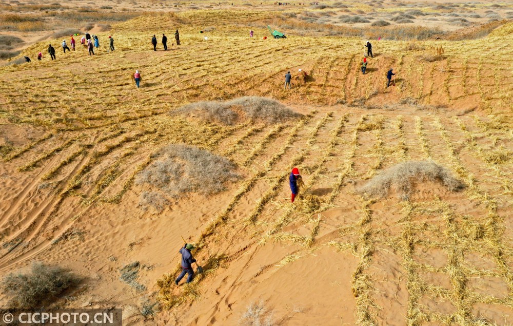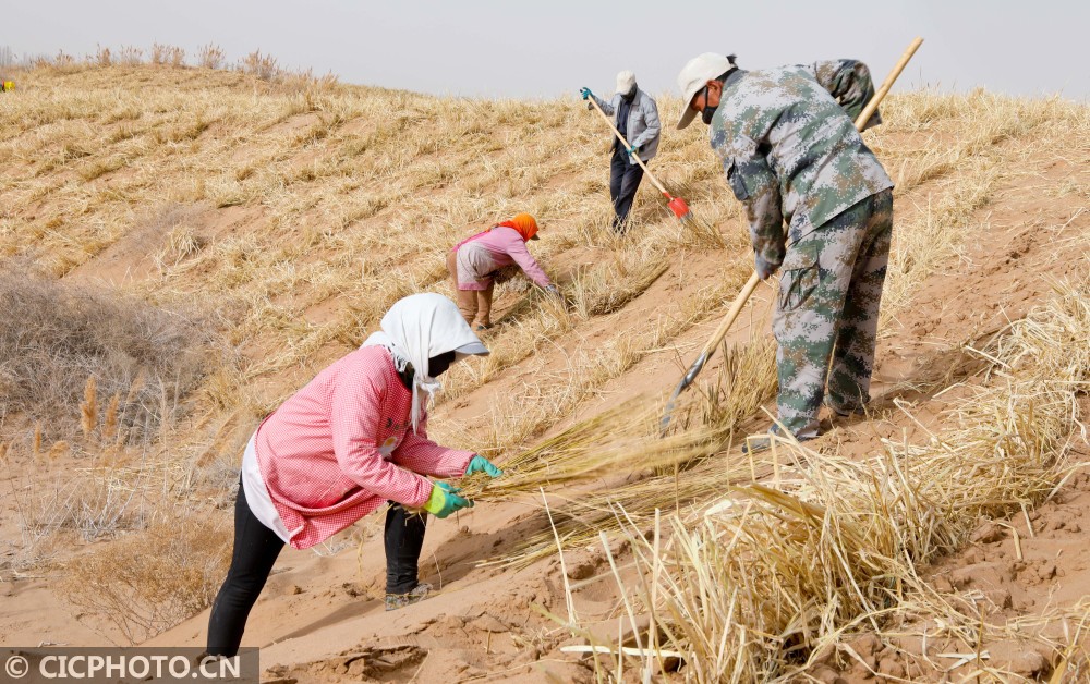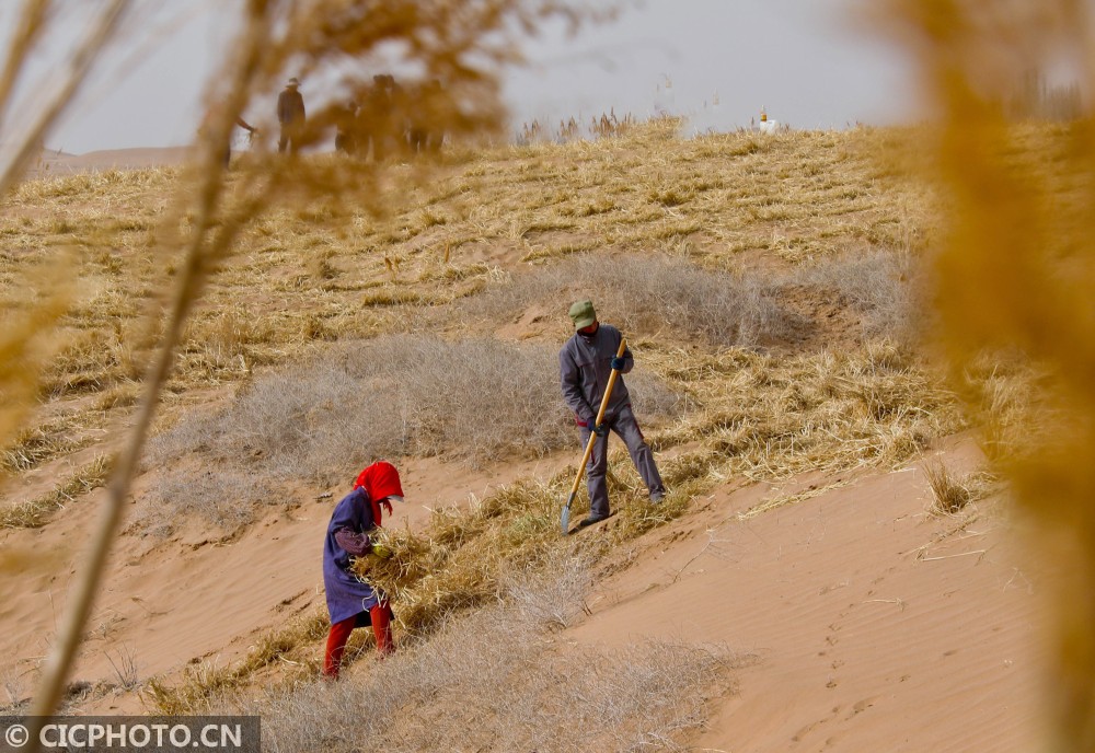 ↑群众在甘肃省张掖市高台县黑泉镇珍珠滩防沙治沙点扎草方格压沙。CICPHOTO/王将 摄