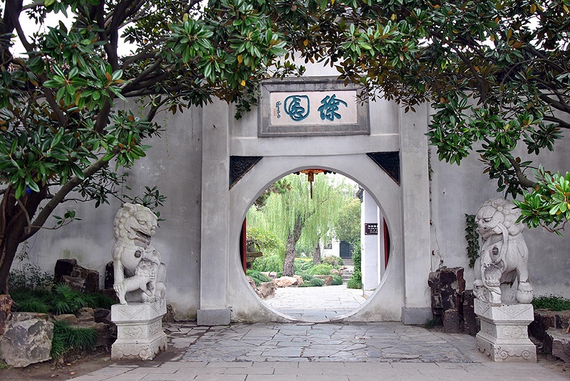 前方小小园林中有一馆,一榭,一亭,外有曲水,内有池塘,花木竹石,恰到好处。此园就是瘦西湖正门进入的第一个园——徐园。园中有园是瘦西湖的特色,前面一道高墙将大片湖水挡住,仅以一圆形的洞门引我们入内。徐园虽为祠堂,却处处尽显江南园林小桥流水,清秀雅致的特点。园子进口处有山石、青松等组成了一个小品。这个小品,在园林建筑手法上叫做障景法。使景观有了节奏,有了深处。