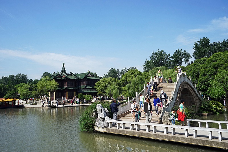 如果说五亭桥是一座画桥,那么二十四桥则是一座诗桥。这瘦西湖上真可谓是诗桥连着画桥,画桥又接着诗桥了。二十四桥由落帆栈道、单孔拱桥、九曲桥及吹萧亭组合而成,中间的玉带状拱桥长24米,宽2.4米,桥上下两侧各有24个台阶,围以24根白玉栏杆和24块栏板。从桥中央往远处看,一定会被周边的美景完全吸引住了!亭台楼阁,相映成趣。清风徐来,水波粼粼。眼前,一艘帆船缓缓而来,从桥下穿过,犹如游龙,好不自在。桥两岸的柳树随风起舞,让人久久回味。