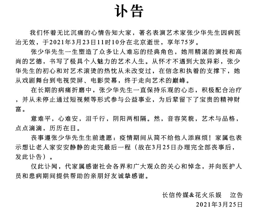著名老戏骨张少华于2021年3月23日在北京逝世,张少华公司发表讣告称张少华老师因慢性阻塞性肺疾病治疗无效死亡。