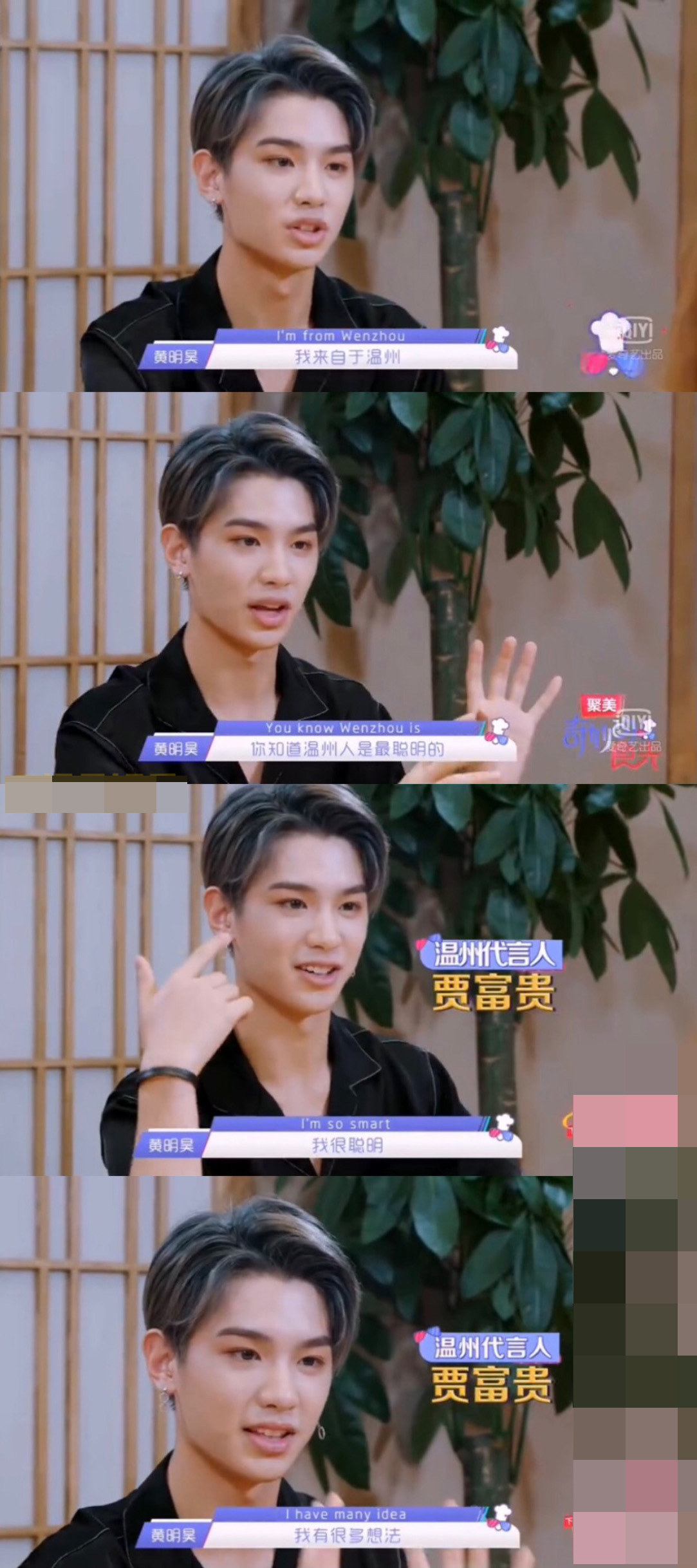 不仅强调自己是温州人,还要传达温州人的精神,给大家介绍温州人是怎么闯出自己的一片天的,哈哈,真的感觉黄明昊是真的以自己是温州人而骄傲了,有关温州人的思想,恨不得让全世界都知道!