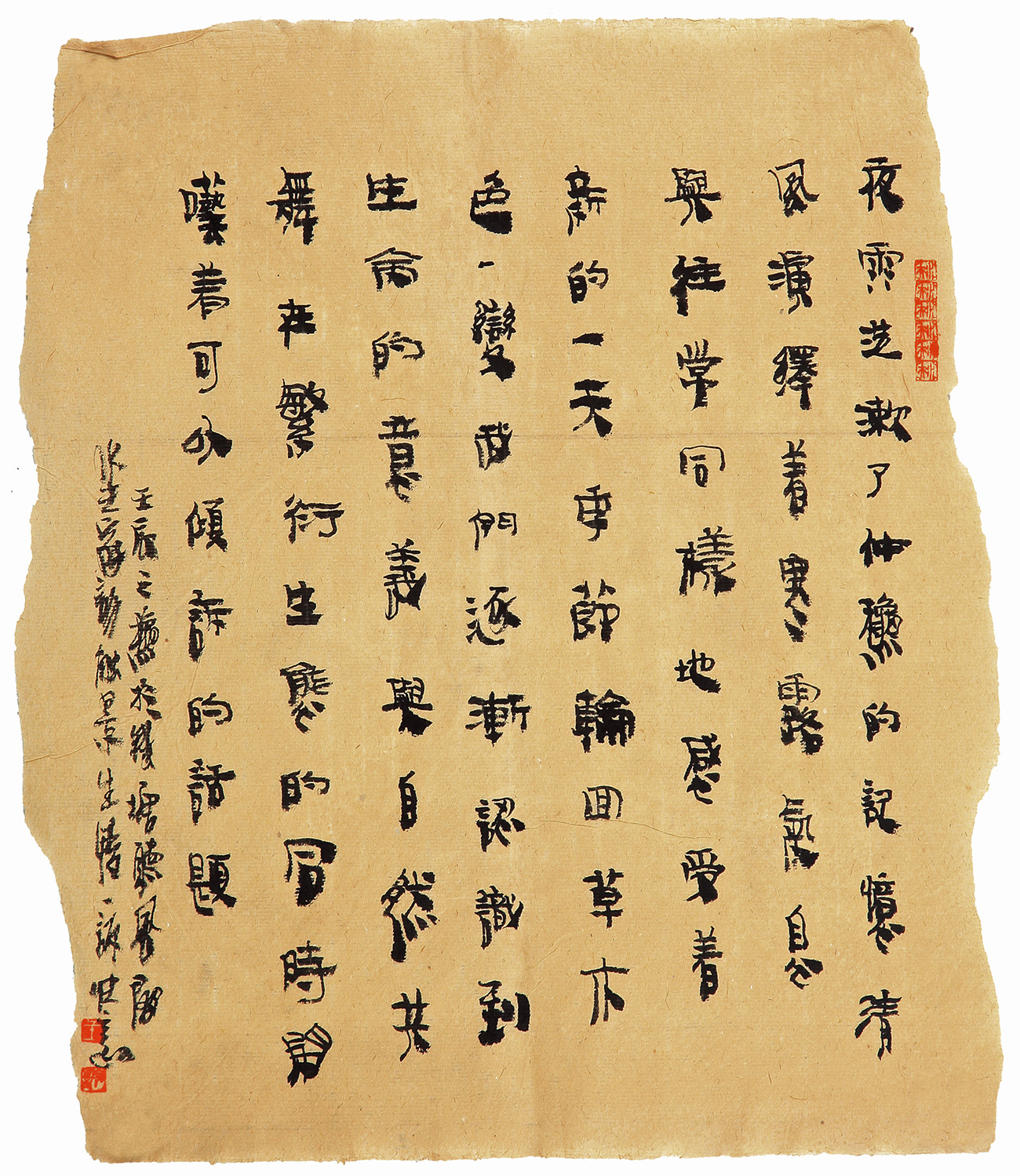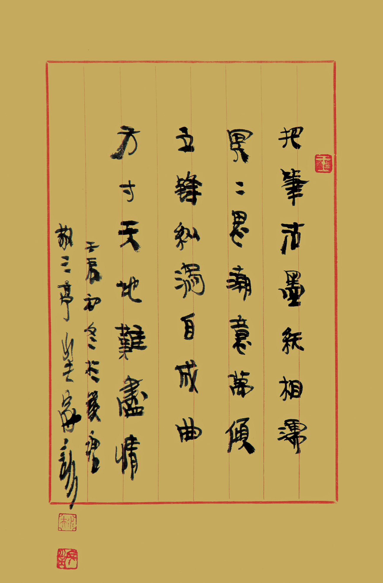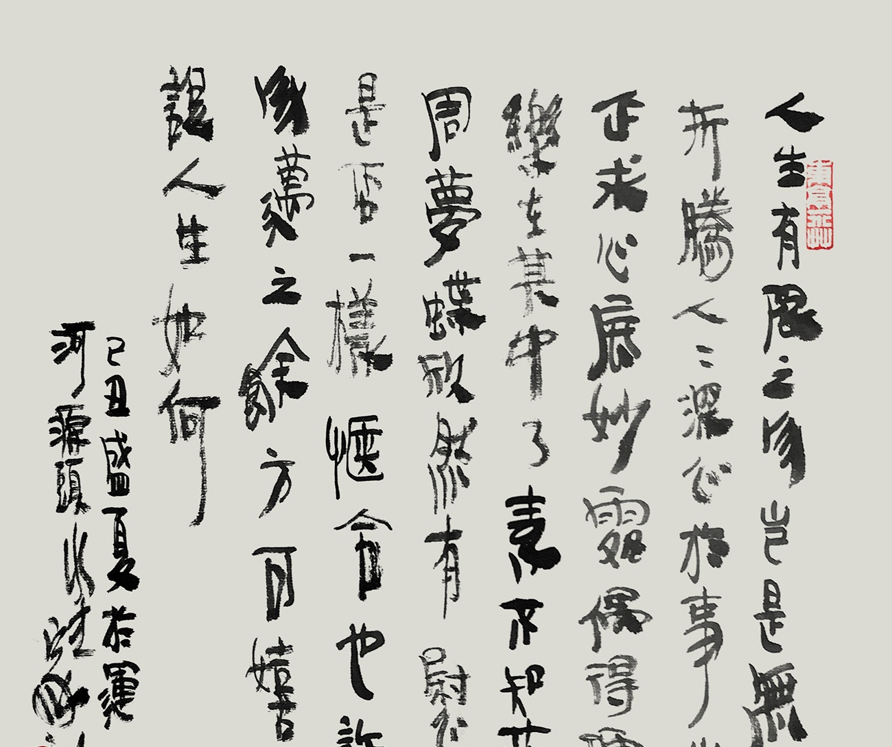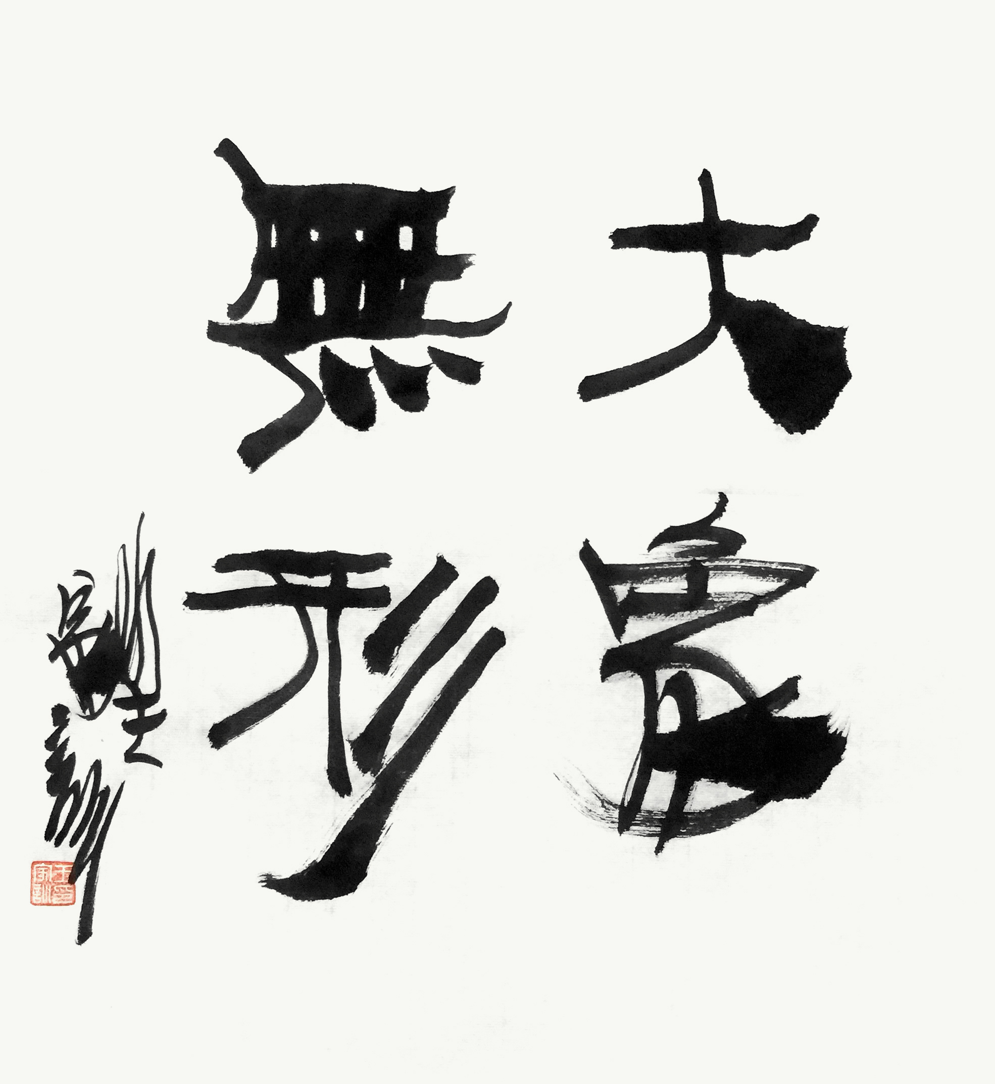 王家训的书法就是他自主、自信、自由、自在的创造性精神的展现。个中并不是稀里糊涂地胡乱擦抹,而是因势利导、应机权变,任情恣性,不抱成见。且笔笔有根、有出处,经得起推敲。它的点画之形、结体之形及通篇构成之形,都有其哲理的情义内涵。