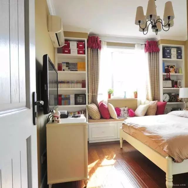 ▼ 飘窗面积比较小,简略规划就能够,下面做成收纳抽屉,不糟蹋空间。