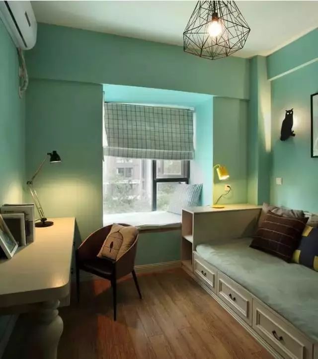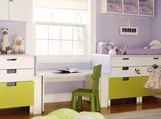 ▼ 使用飘窗台面规划成书桌,搭配一个小小的绿色靠背椅,儿童房瞬间活力起来。
