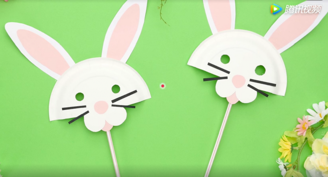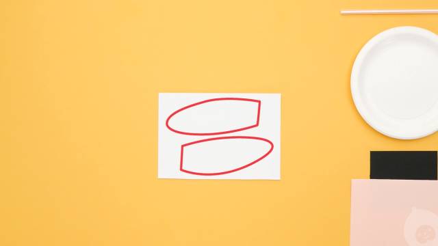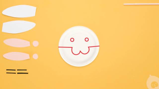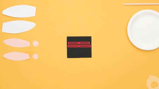 材料:纸盘1张、彩纸(白色,粉色,黑色)各1张、吸管1根。