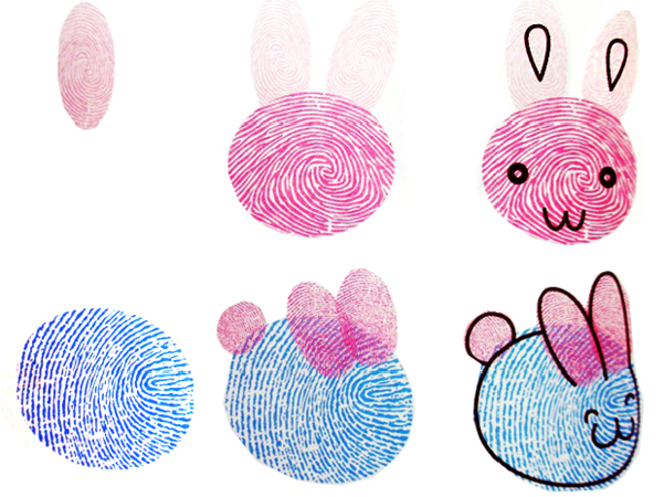 让宝宝用小手蘸取颜料,将指纹或手掌印在纸上,爸爸妈妈在此基础上画出兔子的形状,相信一定会给宝宝带来别样的惊喜。