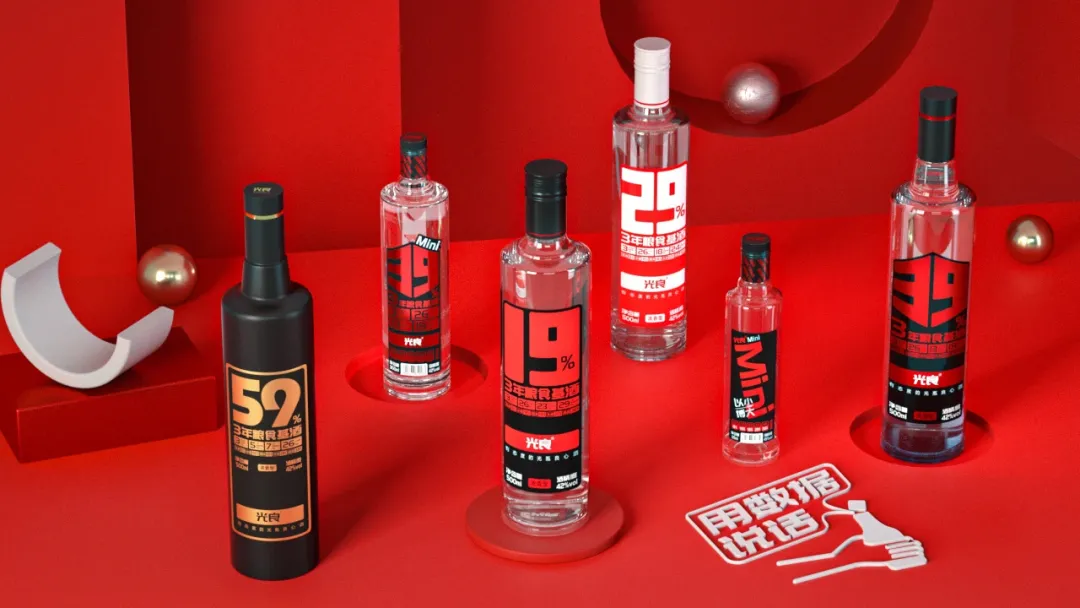白酒是一个传统且成熟的市场,光良酒业作为新品牌,选择以“数据化白酒”来打造差异化。这里的数据化并不是指产业端,而是体现在产品表达形式上——「光良酒业」的品牌理念是“去掉包装喝好酒,好产品用数据说话”。品牌的数据瓶系列在瓶身标注了19、39、59等不同的数字,比如“光良59”,就代表着其三年粮食基酒的含量比例达到59%。
