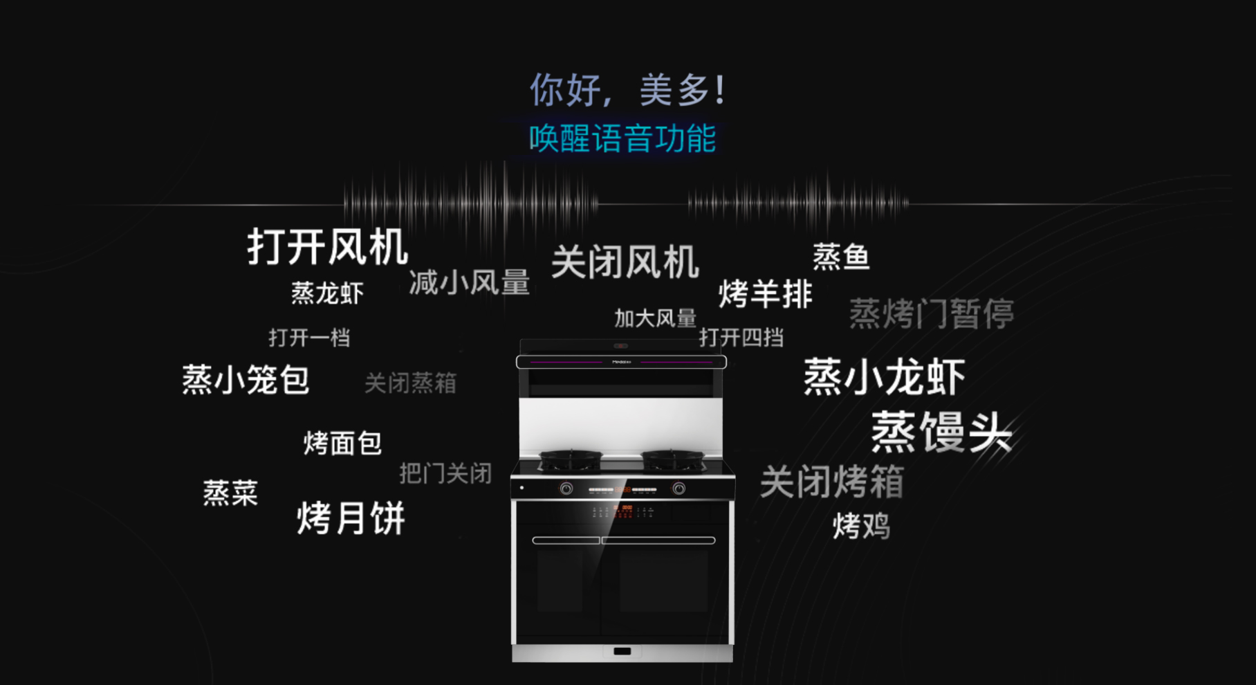 一句“你好,美多”便可开启你的智能厨房生活,全语音控制美多集成灶,动动嘴就能实现多种功能,声音就是你的遥控器,比如双手忙于炒菜无法使用烟机时,便可说“你好美多,打开风机”、“你好美多,加大风量”等语音指令,美多智能AI语音蒸烤集成灶便能自动为你操作;如果你想要更便捷的烹饪美食,也可以将食材提前处理好放进烤箱说“你好美多,烤羊排”、“你好美多,蒸小龙虾”、等烹饪指令,美食“一声令下”即可到达。