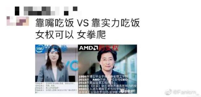 而女权鉴定师就更可笑了——都不用说男性无法替代女性的声音表达、很难体会女性的身体经验与社会困境,今天他们拿AMD CEO作为女权样本,也只是试图用一位女性去攻击、贬低另一位女性。