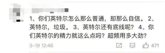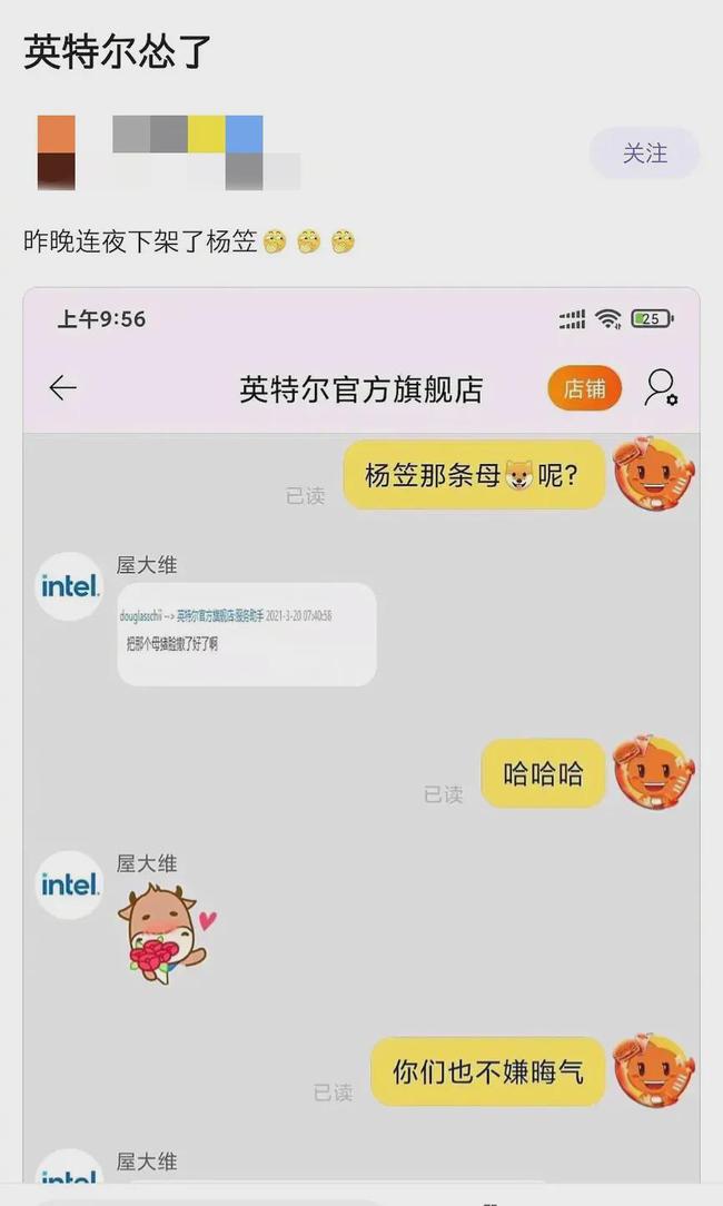 有的把她“普通自信”“男的垃圾”等表演截图翻了出来,作为“侮辱男性”、“挑起性别对立”的证据;有的把矛头转向英特尔,“请骂男人的人来代言男人才购买的电子产品?商家的小脑袋瓜热昏头了吧”;有的对杨笠进行人身攻击;有的发起了举报……