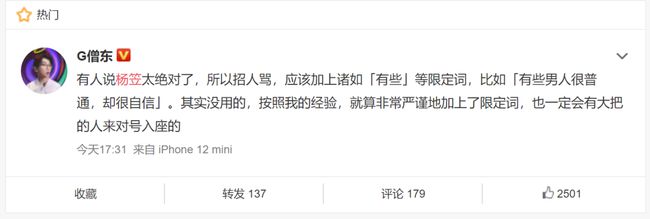 秉持着 “你可以冒犯,但你要限定你冒犯的对象不是我”、“只要我割席,骂的就不是我”原则,指摘杨笠一杆子打死了所有男人。