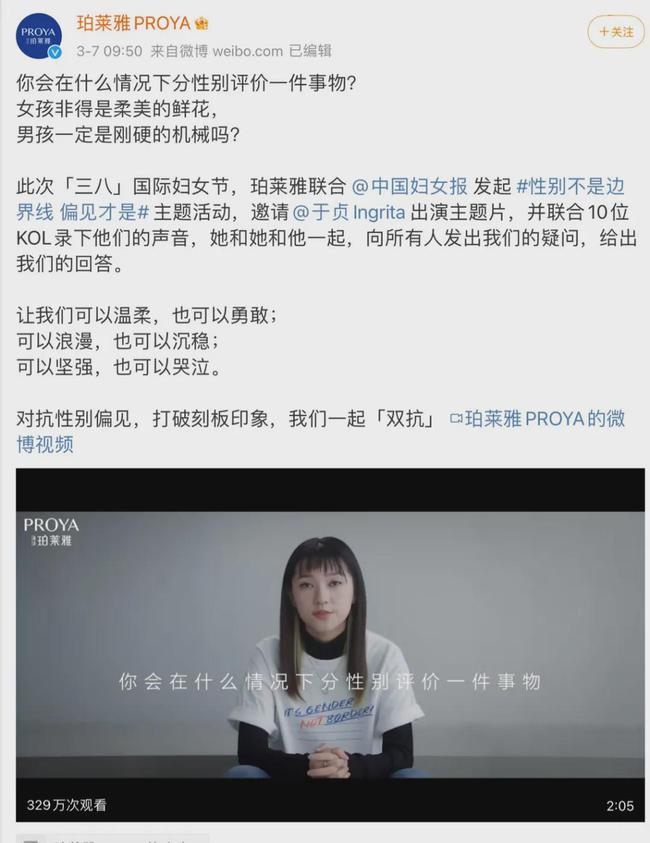 今年国际妇女节,珀莱雅联合中国妇女报发起了#性别不是边界线,偏见才是#的主题活动,并且邀请了女嘻哈歌手、曾就性别议题创作音乐作品的于贞拍摄了主题片。发布后,分享、点赞量均迅速突破10w+,评论量破万,并成功点燃了当天的朋友圈,成为了现象级营销案例。