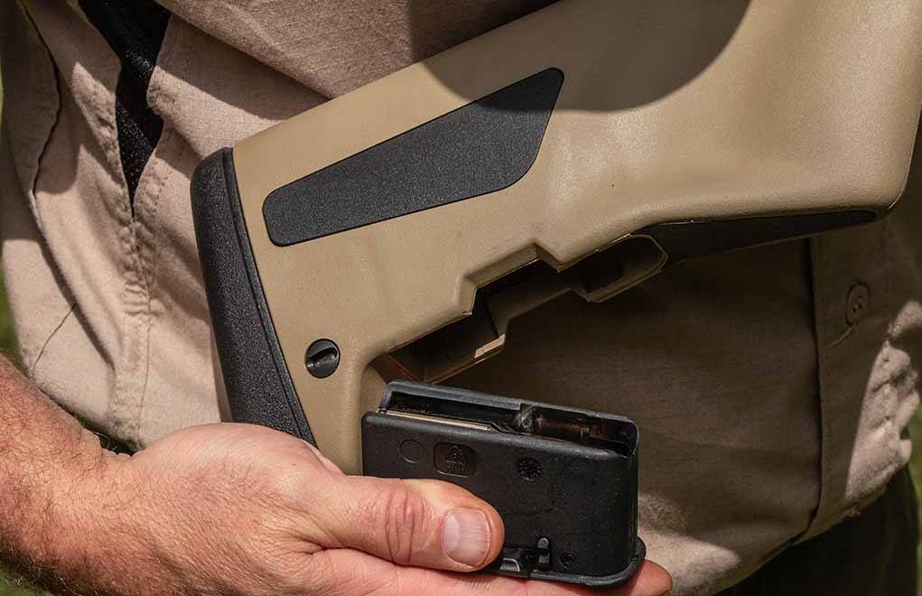 而另外一点是,这枪上可以安放两个弹匣,机匣上插一个弹匣,另外一个弹匣是插在枪托内的,作为备用弹匣使用。这点呢,大概就是:我出去打猎,不用带太多弹匣,直接拎枪就走了。