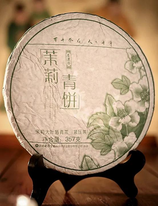茉莉青饼是七彩云南独家研发和开发的专利茶品,采用云南高山生态茶区海拔1600米一芽一叶的优质大叶晒青茶原料,将云南元江县极品茉莉花的浓郁花香窨进普洱生茶中,从而让花香清新鲜灵,如此反复九次,制成蕴含茉莉花香的普洱生茶。