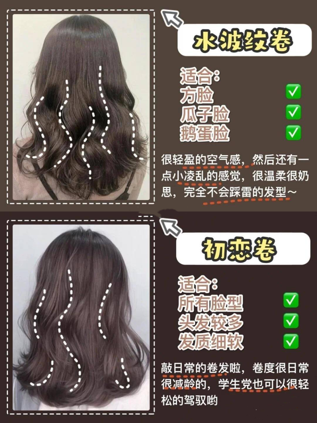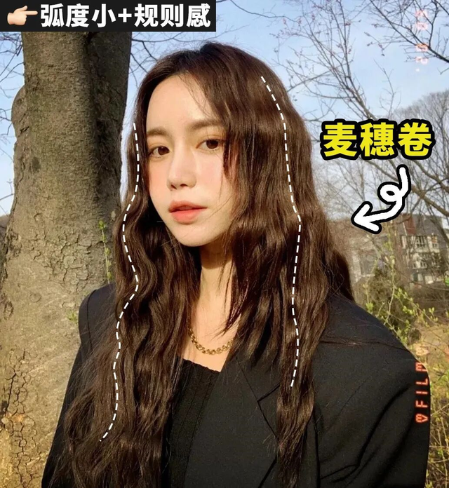 还有最近新出的一款麦穗卷,它在水波卷的基础上增加了一些小的卷,整体头发从上至下不是很规则地卷下来,层次感也比较丰富,颇具田园风。