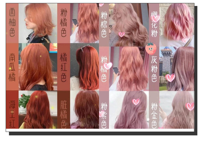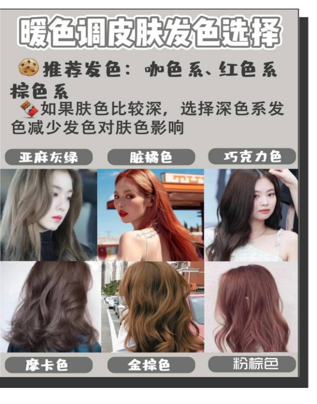 暖色皮肤:①推荐选择红调色系的发色,显肤白,显气色;②慎选冷调色系。