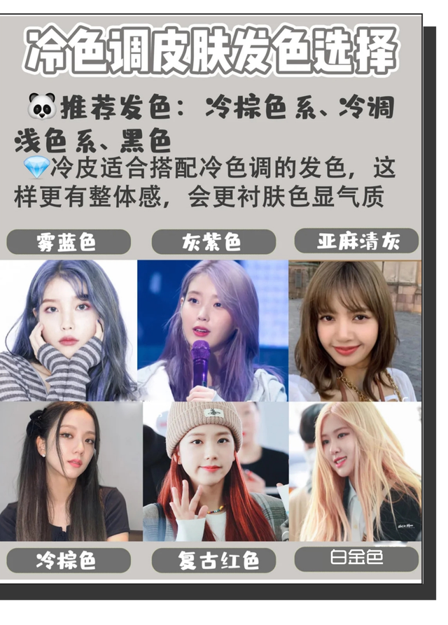 冷色皮肤:①推荐选择深色、冷调色系,显肤白;②黄调色系无功无过,不突出个人优点;③慎选红色系。