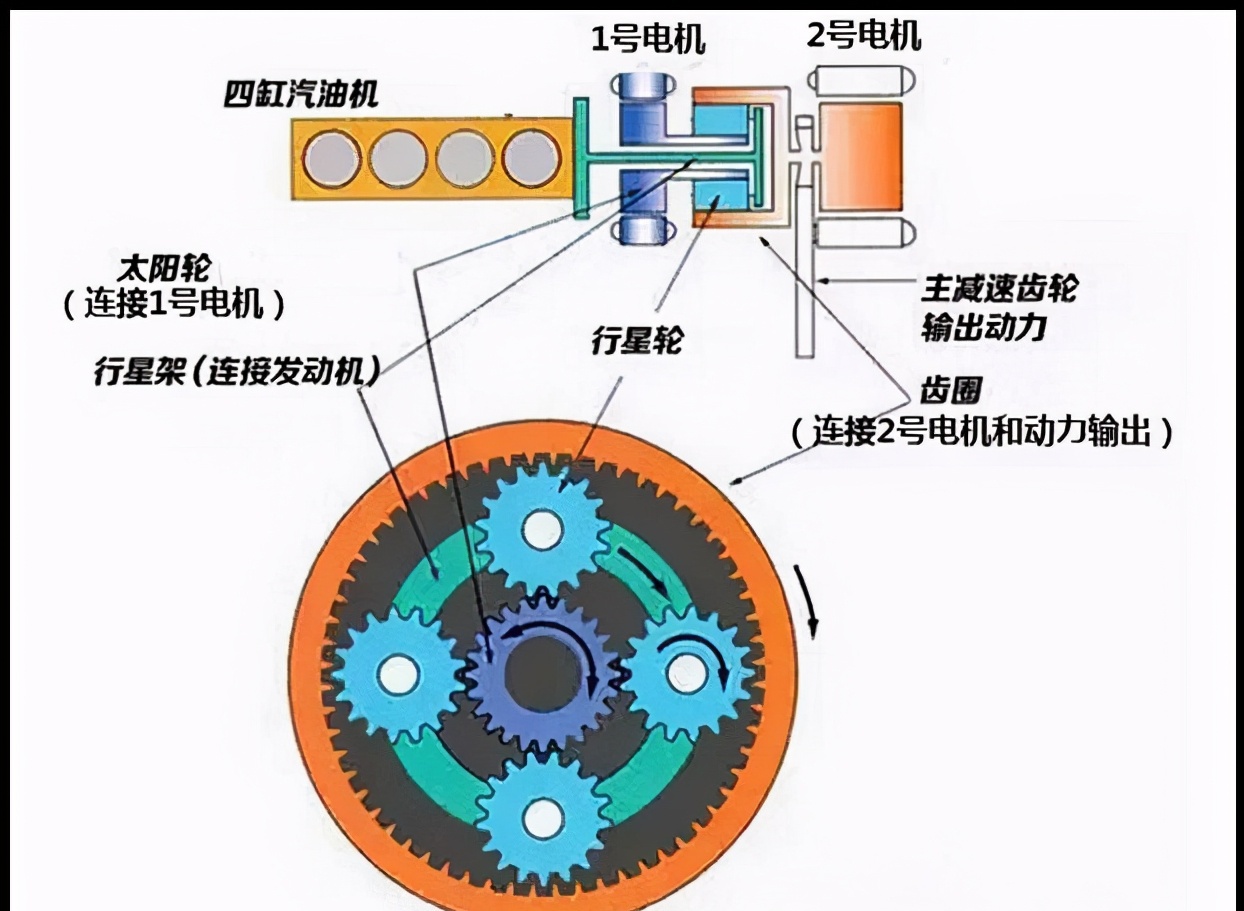 这和丰田的E-CVT有啥关系呢?上面说了,E-CVT的原理本来就基于行星齿轮系,这里粗陋的比喻一下:倘若外齿圈和汽油机连接,中心太阳轮和电机连接,车轮和行星架连接,不就构成了最简单、最原始的E-CVT了么?