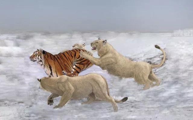 3、远东北亚巨虎,史上最强猫科动物,远东北亚巨虎身长可达四米多,比现代的东北虎还大一半以上,远东北亚巨虎生活在远东森林与草原的交叉地带,主要伏击猛犸象等大型食草动物。与其食谱相同的是亚洲杨氏虎和剑齿虎族,远东北亚巨虎在整个食物链上处于最顶级,它们无惧其他野兽的竞争,是历史上最大最强的猫科动物。