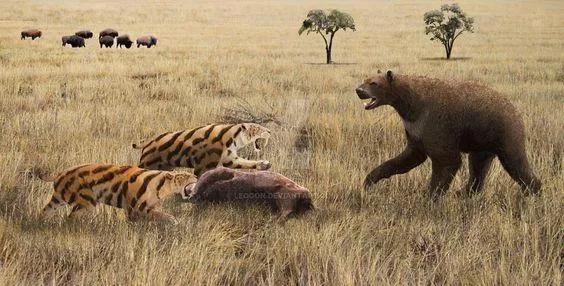 2、巨型短面熊,是北美史上第一大猛兽,北美大陆在远古时期巨兽最为繁盛的地方,几乎所有在历史上留名的猛兽都在北美大陆上生存过,其他大陆的顶级猛兽到了北美大陆就是弟中弟。巨型短面熊是其中的佼佼者,其身高可达四米,一双强壮的双爪是有力的武器,剑齿虎在巨型短面熊的攻击下不能撑过一个回合。巨型短面熊皮毛很厚,即使是美洲拟狮偷袭它,它也不会有太大伤害,足够发起反击。它们独来独往,无所顾忌,即使是猛犸象也得避其锋芒,在弱肉强食、竞争极其惨烈的远古时期,巨型短面熊是唯一不需要顾忌其他野兽威胁,生活的最无忧无虑的动物。